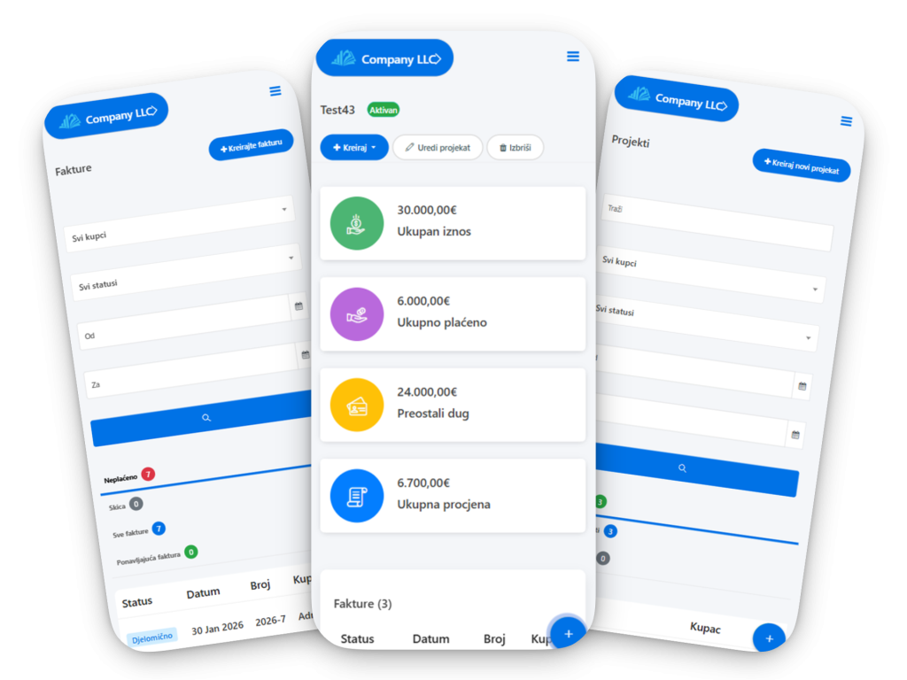 Funkcije aplikacije 9 Upravljačka ploča Kreiranje, praćenje i upravljanje projektima Kreiranje i upravljanje fakturama Kreiranje i upravljanje profakturama Upravljanje računima, dobavljačima, troškovima i proizvodima Upravljanje kupcima/klijentima